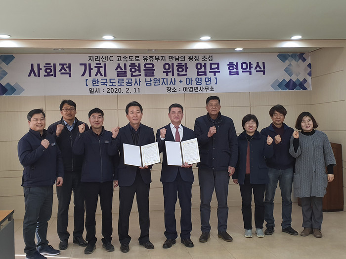 한국도로공사 남원지사와 아영면은 지난 11일 아영면사무소에서 양 기관간의 업무협약을 맺고 한국도로공사 유휴토지에 지리산IC 만남의 광장 주차장을 설치하기로 합의했다.