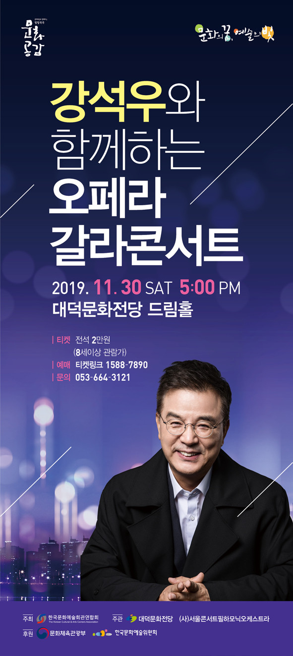 이번 갈라콘서트는 ‘2019 문예회관과 함께하는 한문연 방방곡곡 문화공감사업’의 일환으로, 배우 강석우의 오페라 해설과 함께 최고의 성악가들이 무대 위에서 오페라 아리아, 영화음악 등을 들려준다.