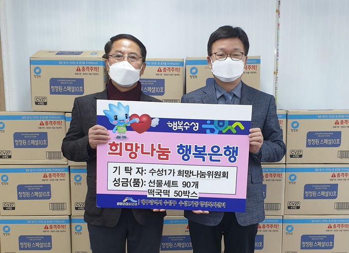 [로컬세계 박세환 기자]대구 수성구 수성1가동 희망나눔위원회(위원장 권춘석)는 지난 5일 설명절을 맞아 어려운 이웃을 위해 써달라며 떡국떡 50상자와 선물세트 90개를 수성1가동행정복지센터에 전달했다.