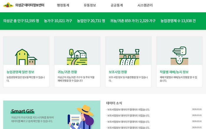 [로컬세계 박상진 기자]경북 의성군은 지난 2018년 4차산업의 핵심인 ‘빅데이터’ 기법을 행정에 도입하기 위해 ‘데이터 정보센터 플랫폼’ 구축을 위한 연구용역을 진행해 1차 사업으로 농업부문 플랫폼 구축을 추진했다. 그 결과 현재 데이터 정보센터 홈페이지를 개설해 농업분야 플랫폼 구축이 코 앞으로 다가왔다고 24일 밝혔다.