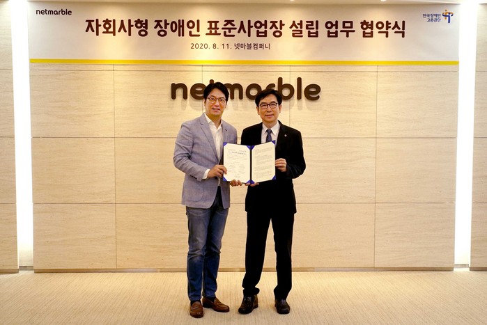 ▲ 넷마블과 한국장애인고용공단은 11일 장애인표준사업장 설립 MOU를 체결했다. 왼쪽부터 넷마블 이승원 대표, 한국장애인고용공단 남용현 이사 |