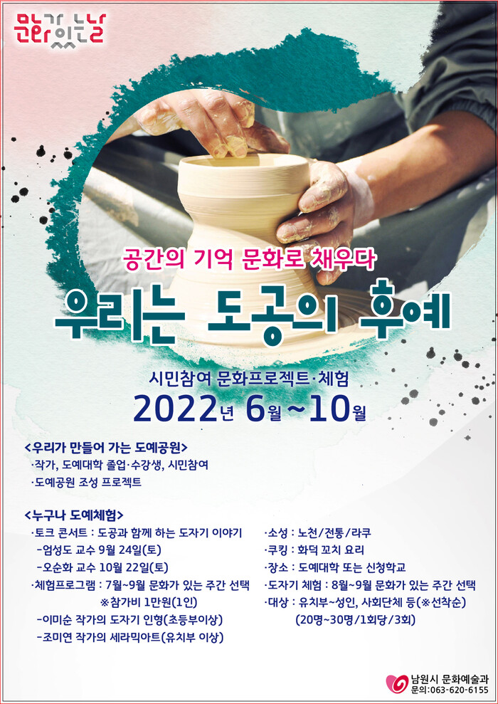 남원시에 따르면 이 사업은 문화체육관광부 공모사업에 선정된 사업으로 시가 주최하고 (사)남원국제도자예술연구센터가 주관하며 지역작가들과 함께하는 우리가 만들어 가는 도예공원과 누구나 가능한 도예 체험 등 이 펼쳐진다.