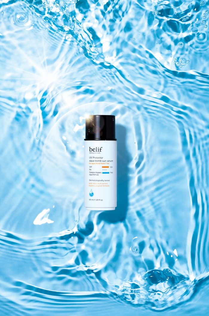 트루 허브 코스메틱 빌리프가 출시한 이번 신제품 ‘UV 프로텍터 아쿠아 밤 선 세럼(SPF 50+ / PA++++)’은 강력한 자외선 차단 효과는 물론, 주름, 미백 등 3중 기능성을 갖춘 일명 ‘수분폭탄™ 선 세럼’ 제품이다. 기초 스킨케어 제품처럼 부드럽게 발리고 끈적임 없이 밀착되어 피부를 매끄럽고 생기있게 만들어준다.