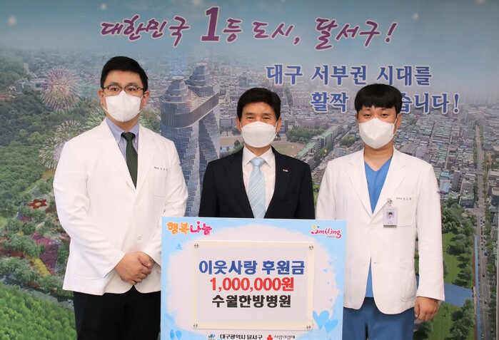 [로컬세계=박세환 기자] 대구 달서구(구청장 이태훈)는 지난7일 수월한방병원(원장 김은숙)으로부터 후원금 100만원을 기탁 받았다고 밝혔다.