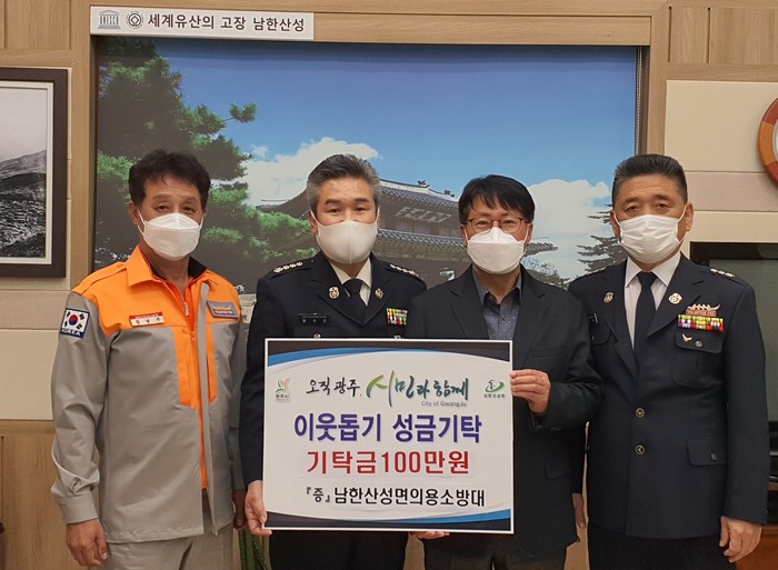 [로컬세계 김병민 기자]경기 광주시 남한산성면 의용소방대(대장 황수근) 회원들은 4일 남한산성면 행정복지센터를 방문, 이웃돕기 성금 100만원을 기탁했다.