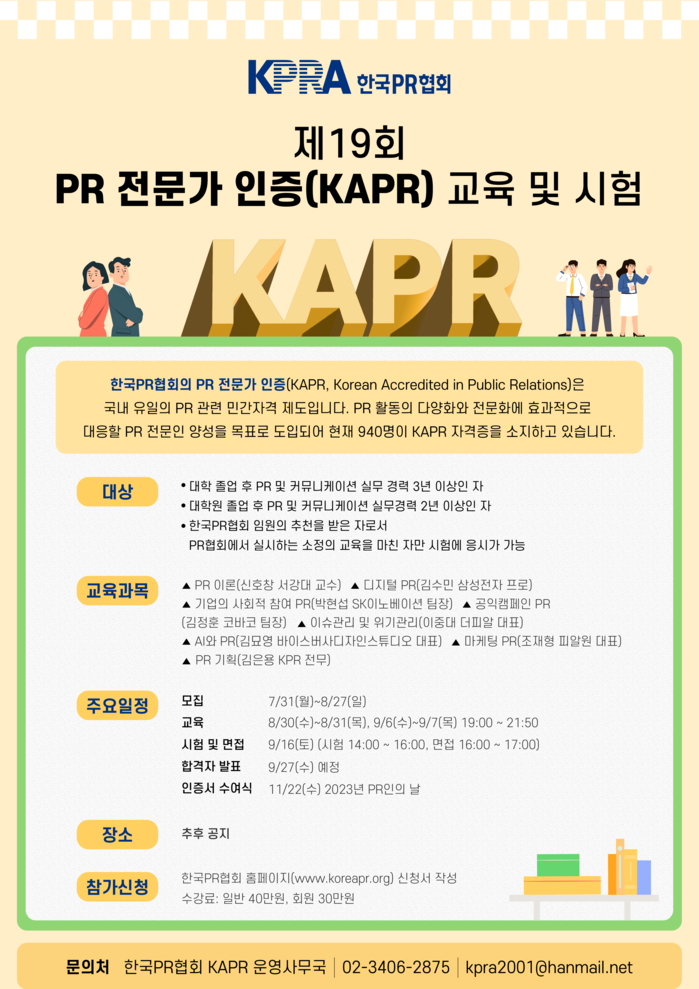 한국PR협회(회장 김주호)가 제19회 PR 전문가 인증 (KAPR, Korean Accredited in Public Relations) 시험을 실시한다.