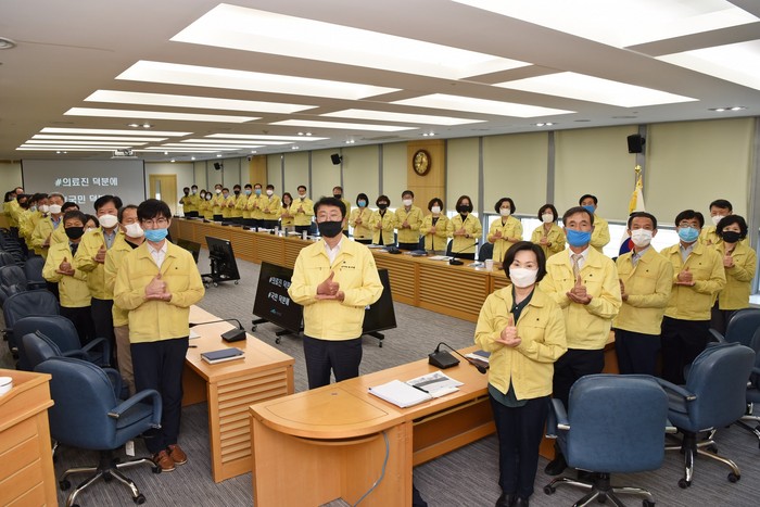 11일 박재범 남구청장과 간부공직자들은 의료진에 대한 존경과 자부심을 의미하는 수어동작과 더불어‘힘내세요, 건강하세요’를 의미하는 수어동작으로 응원 메시지를 전했다.