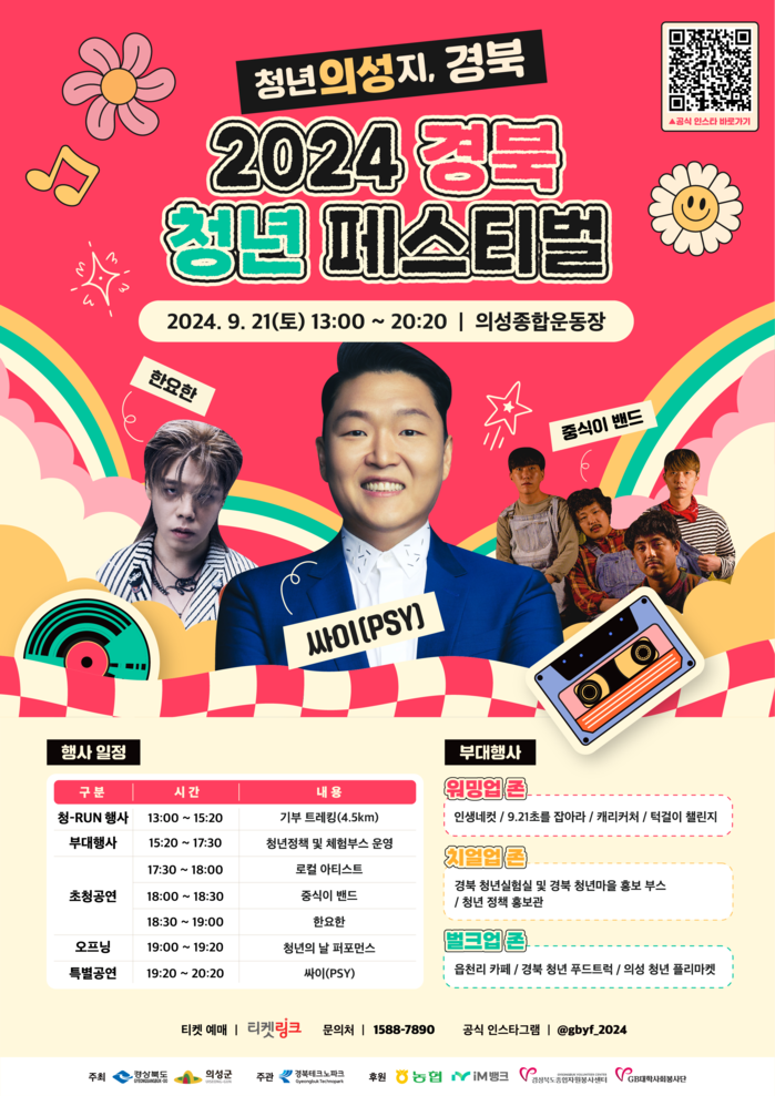 특히 이번 행사에는 경북지역 지자체 행사로는 처음으로 글로벌 스타 싸이(PSY)의 특별공연이 예정되어 있으며, △한요한 △중식이밴드 △로컬 아티스트(디아만테, 돌담 곁에 이끼)의 공연과 청년 워밍업, 청년 치얼업, 청년 벌크업을 주제로 경북 청년정책 소개, 인생네컷 촬영, 청년 플리마켓 등 다양한 부대행사도 계획중이다.