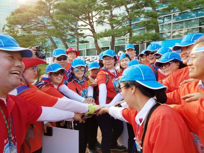▲원주시민 걷기 운동본부 회원들이 파이팅하며 결속을 다지고 있다. |