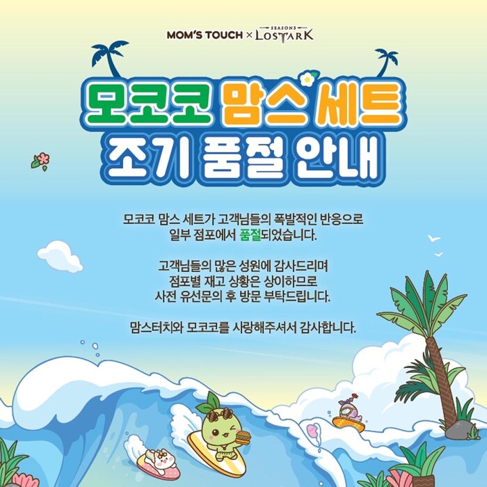 이에 전국 대부분 매장에서 준비한 수량이 빠르게 소진됨에 따라, 맘스터치는 지난달 22일부터 공식 SNS를 통해 ‘모코코 맘스 세트’의 일부 점포 품절 소식을 알리며, 고객 불편이 없도록 미리 유선으로 점포별 재고 상황을 확인하고 방문해 줄 것을 당부했다.