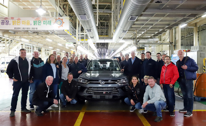 ▲쌍용자동차는 지난 16일부터 3박 4일의 일정으로 독일, 벨기에, 스위스 대리점 및 산하 딜러(영업점) 관계자 60여 명을 평택 본사로 초청해 회사의 현황과 미래를 공유하는 시간을 가졌다. 지난 17일 쌍용자동차 평택공장을 방문한 중부유럽 대리점 및 딜러 관계자들이 생산된 코란도 옆에서 단체촬영을 하고 있다.(쌍용자동차 제공) |
