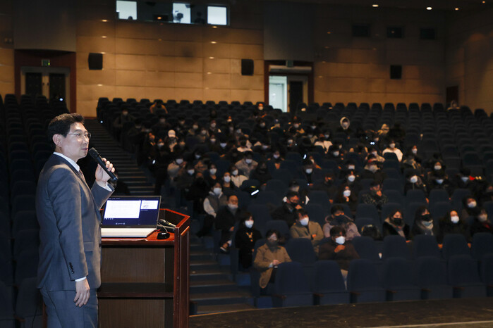 | ▲ 이상일 용인특례시장이 용인대학교 교육대학원 학술 세미나에 강연자로 참석해 200여 명의 학생에게 리더가 가져야 할 덕목과 경계해야 할 것들을 이야기 하고 있다. 용인특례시 제공 |