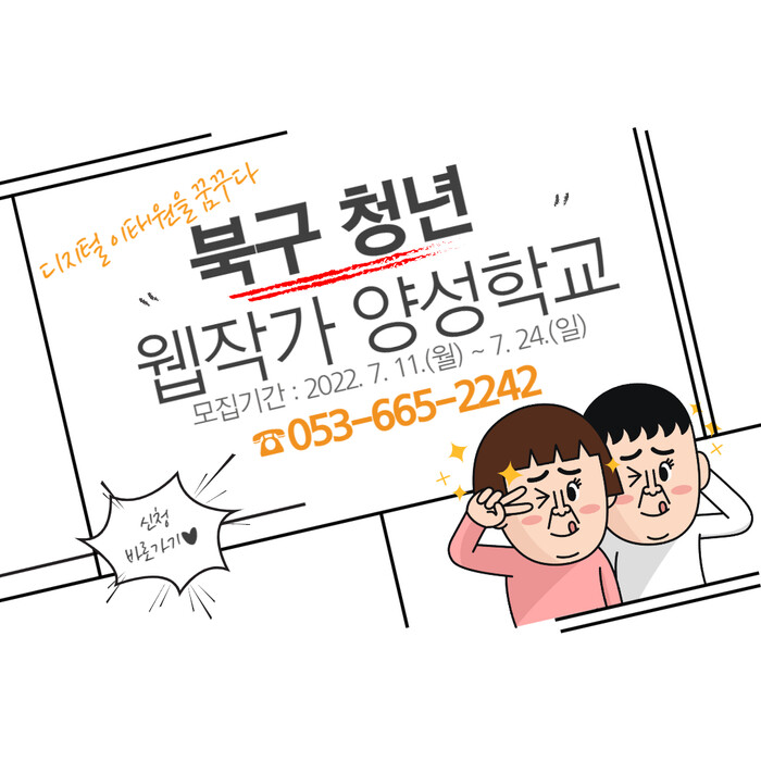 [로컬세계=박세환 기자] 대구 북구청(청장 배광식)은 11일부터 웹 작가 지망 청년들에게 자신감을 고취시키고 관심 분야에 대한 경험을 제공하며, 인기 지역 웹작가에게는 지역사회에 봉사하는 계기를 마련하는 '청년 웹작가 양성학교' 참가자를 모집하기 시작했다.