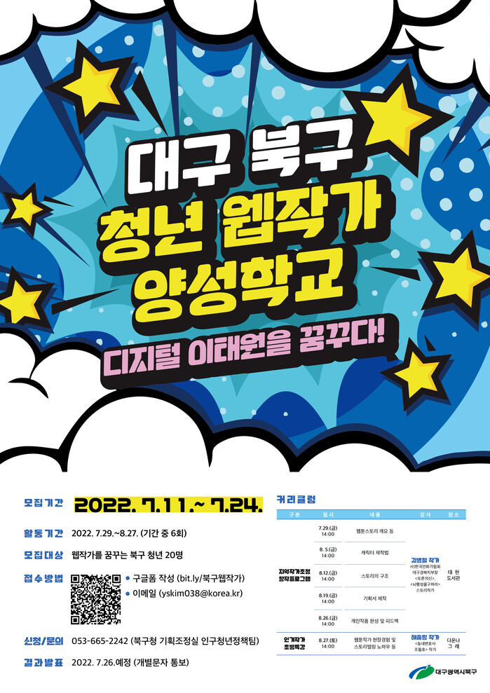 모집은 오는 24일까지이며 신청은 구글폼 온라인으로 진행한다. 모집대상은 20명이며 소수 그룹을 대상으로 기획서 제작, 캐릭터 제작법, 스토리의 구조, 개인작품 완성 및 피드백 등 창작 프로그램을 오는 29일부터 8월 26일까지 매주 금요일 총 5주간 진행할 계획이라고 한다. 프로그램은 지역 스토리작가이자 (사)한국만화가협회 대구경북지부장인 김병철 작가가 진행한다.