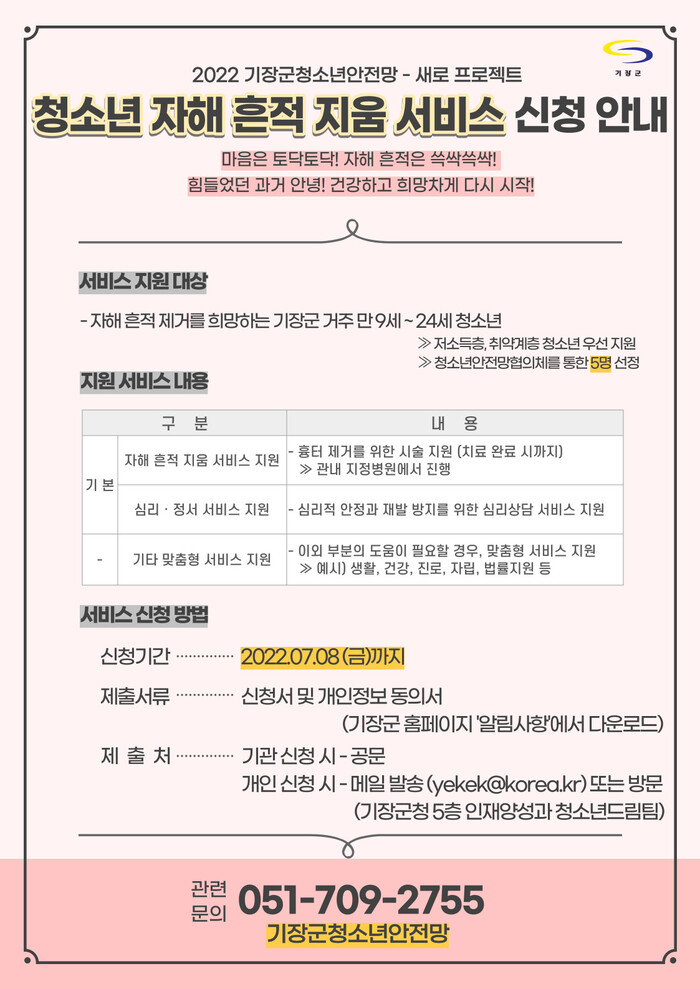 지원대상은 기장군 거주, 만9세 ~ 24세 청소년 중 자해 흉터 제거를 희망하는 위기청소년으로 저소득‧취약계층 청소년을 우선적으로 지원한다.