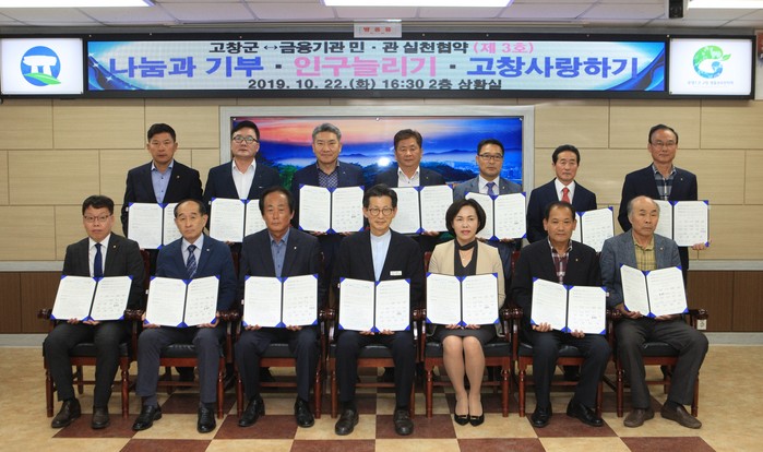 이날 협약에는 고창우체국, NH농협은행 고창군지부, 전북은행 고창지점, 고창부안축협, 고창군수협, 고창군산림조합, 고창신협, 고창새마을금고, 고창농협, 대성농협, 선운산농협, 해리농협, 흥덕농협 총 13개 금융기관 대표가 참석했으며 고창군의 인구감소와 나눔과 기부에 민관이 상호 협력과 실천을 약속했다.
