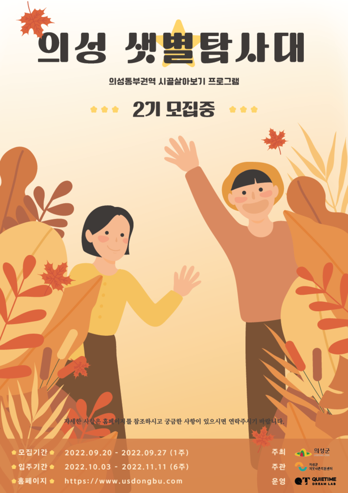 [로컬세계=박상진 기자]경북 의성군은 청년들을 대상으로 농촌에서 살아보는 지역체류 프로그램인 ‘의성샛별 탐사대’ 2기 참가자를 오는 27일까지 모집한다고 22일 밝혔다.