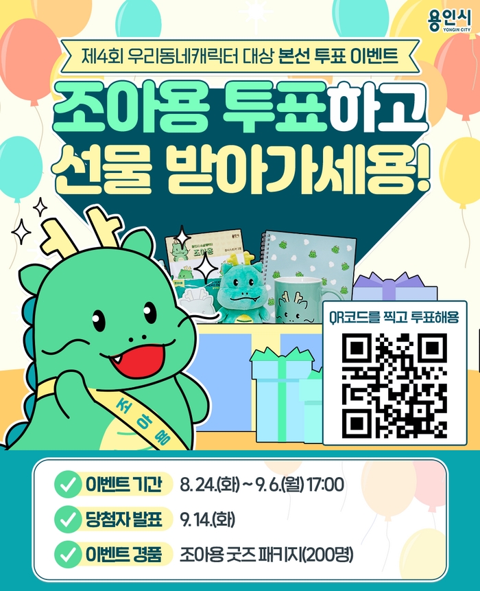 참여를 원하는 시민은 우리동네캐릭터 홈페이지에 접속해 투표를 완료한 후 투표 인증 화면을 캡처해 네이버폼에 입력하면 된다. 시는 오는 9월 14일 당첨자를 추첨해 용인시 블로그에 게시할 예정이다.