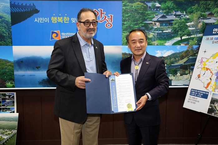[로컬세계 주덕신 기자]황은성 안성시장이 해외 자매도시인 미국 캘리포니아 브레아시로부터 미국 브레아시 명예시민증을 수여받았다.