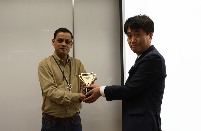 ▲차크라보티 CPLB 대표가 우수 파트너사 중 한 곳인 김동호 새벽들 대표에게 시상하고 있다. |
