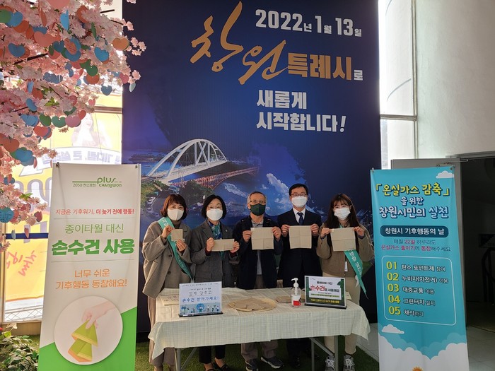 [로컬세계 한용대 기자]경남 창원시(시장 허성무)는 매월 22일인 ‘창원시 기후행동의 날’을 맞아 시청 본관 1층 출입구에서 민원인을 대상으로 종이타월 대신 손수건 사용 동참 홍보 캠페인을 실시했다.