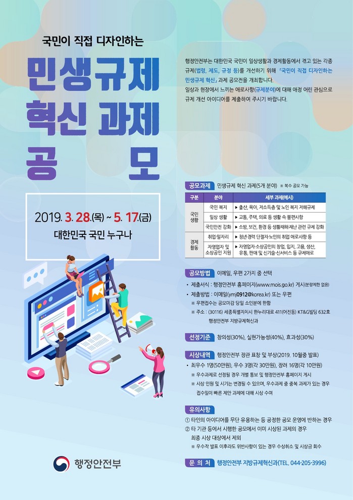 응모된 제안은 생활공감모니터단, 규제·안전·소상공인 전문가 등으로 구성된 민생규제심사단의 심사를 거쳐, 오는 10월 행안부 장관 표창과 함께 소정의 시상금을 수여할 예정이다.
