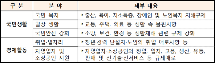 이번 공모는 ▲국민복지 ▲일상생활 ▲국민안전 강화 ▲취업·일자리 ▲자영업자 및 소상공인 지원 등 5개 분야로 나눠 국민생활과 지역경제 활동 전반을 아우르는 민생규제에 대한 개선 아이디어를 접수 받는다.