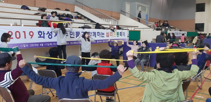 | ▲화성시보건소 웰빙건강클리닉센터는 11일 한신대 체육관에서 ‘어르신과 함께하는 심리운동축제’를 개최했다.(화성시 제공) |