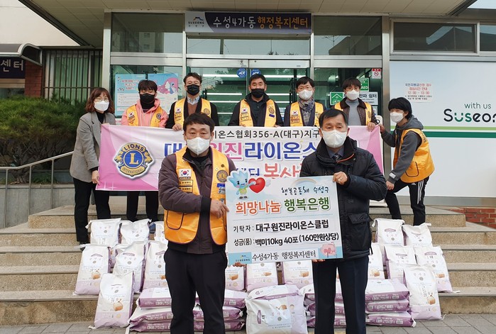 [로컬세계 박세환 기자]대구 국제라이온스협회 356-A(대구)지구 원진라이온스클럽(회장 백승홍)은 지난 23일 코로나19로 경제적·정서적으로 어려움을 겪고 있는 이웃들을 위해 백미 10kg 40포(160만 원 상당)를 수성4가동 행정복지센터에 전달했다.