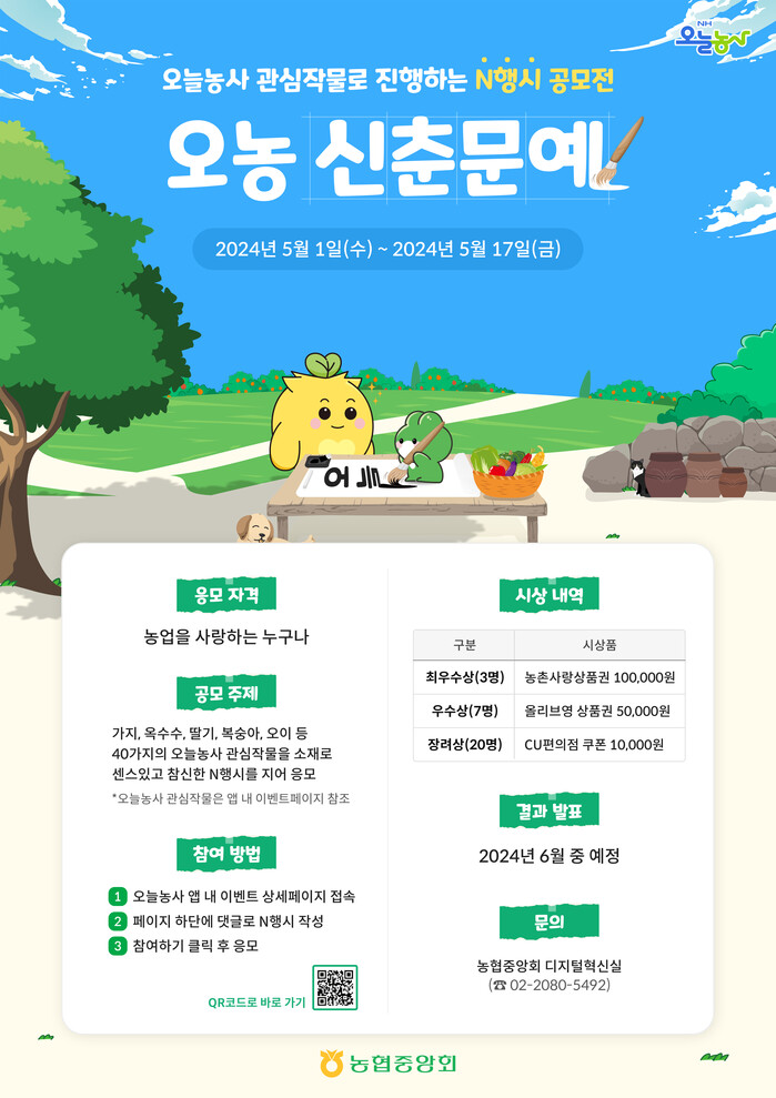 농협중앙회(회장 강호동)의 영농플랫폼「NH오늘농사」는 5월 1일부터 17일까지 희망농협, 행복농촌 구현의 의미를 담아‘오농 신춘문예 이벤트’를 실시한다.