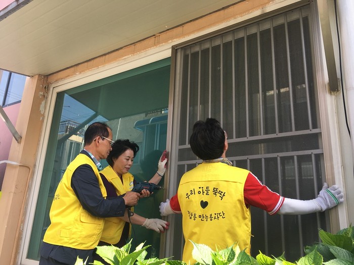 특히 이번 사업에는 ‘우리 아들 뚝딱’ 만능봉사단원들 뿐만 아니라 경암동 협의체 위원 및 경암동 자원봉사자 등이 직접 대상 가구를 방문해 방충망을 설치·수리하고, 구암동에 위치한 동아금속(대표 전성철)에서 방충망 재료를 후원해 이웃사랑 실천의 의미를 더하고 있다.