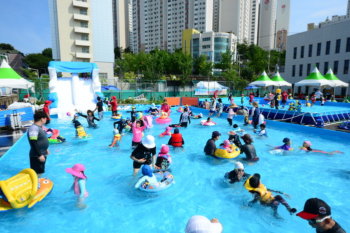 [로컬세계 맹화찬 기자]부산 연제구(구청장 이성문)는 지난 1일 부산경상대학교 전용주차장에 아이들과 가족에게 피서를 겸한 휴식공간인 야외물놀이장을 개장했다.(사진=부산 연제구 제공)