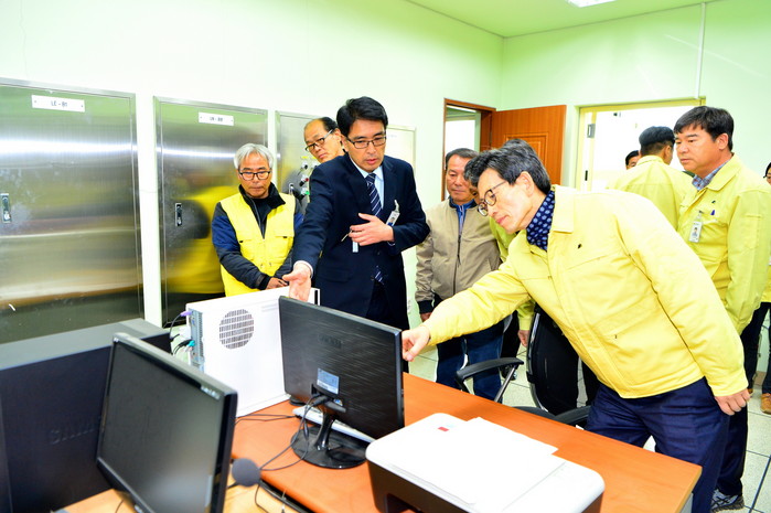 이날 유기상 군수는 체육관 점검에서 비상시 대응체계와 환기팬 작동 여부, 유도등 및 소화기 비치 상태와 방화문 작동여부를 확인한 후 열화상 감지기를 활용해 분전반 내 전기시설에 대한 안전점검을 실시했다.