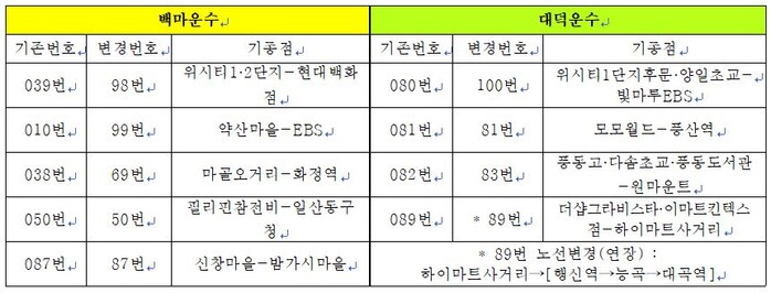 버스번호는 0으로 시작하는 마을버스 번호체계에서 시내버스 번호체계에 따라 새롭게 변경되며, 버스 외부는 마을버스의 노란색에서 시내버스 지정색인 청록색으로 바뀐다.