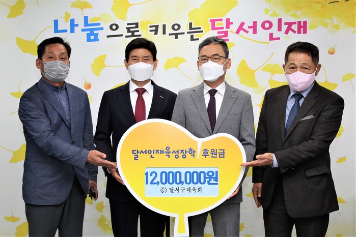 [로컬세계 박세환 기자]대구 달서구는 8일 사단법인 대구광역시달서구체육회에서 지역 인재육성을 위해 써달라며 1200만원을 후원금을 (재)달서인재육성장학재단에 전달했다고 9일 밝혔다.