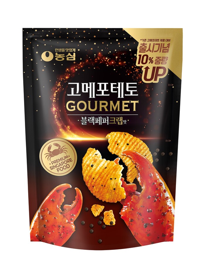 농심 고메포테토 블랙페퍼크랩맛은 오는 8일부터 전국 대형마트를 시작으로 판매될 예정이다. 기존 제품 대비 중량을 10% 늘렸다. (68g → 75g)