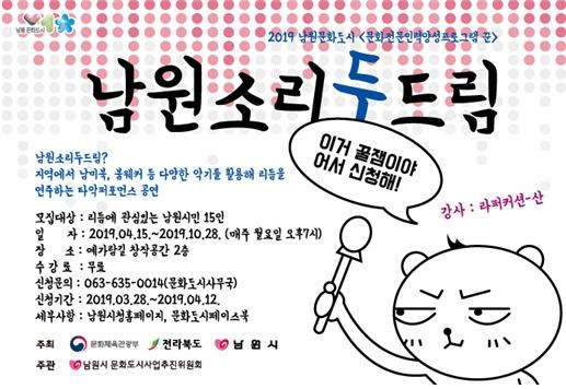 신청기간과 모집 대상은 4월 12일까지 음악과 타악에 관심 있는 남원시민이면 누구가 가능하다. 수강생들은 프로그램을 통해 신체와 다양한 악기, 사물을 활용한 리듬을 배우는 과정을 거친다.