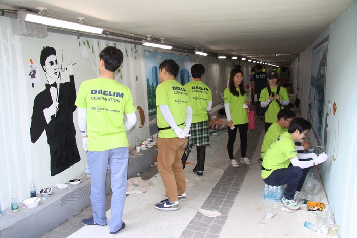 이번 행사는 ㈜대림코퍼레이션과 한국해비타트가 주최하고 ㈜대림코퍼레이션 임직원 및 미술전공 대학생 등 자원봉사자 200여명이 참여해 폭 2.1m, 연장 190m에 달하는 어두운 지하통로를 아름답게 꾸미는 작업을 실시했다.