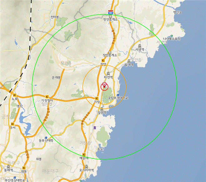 ▲부산시는 19일 기장군의 한 농장에서 조류인플루엔자 H5형 항원이 검출됨에 따라 긴급 방역 조치를 시행한다고 밝혔다. 조류인플루엔자가 검출된 기장군 농장을 중심으로 한 방역권역 반경 위치도. 부산시 제공 |