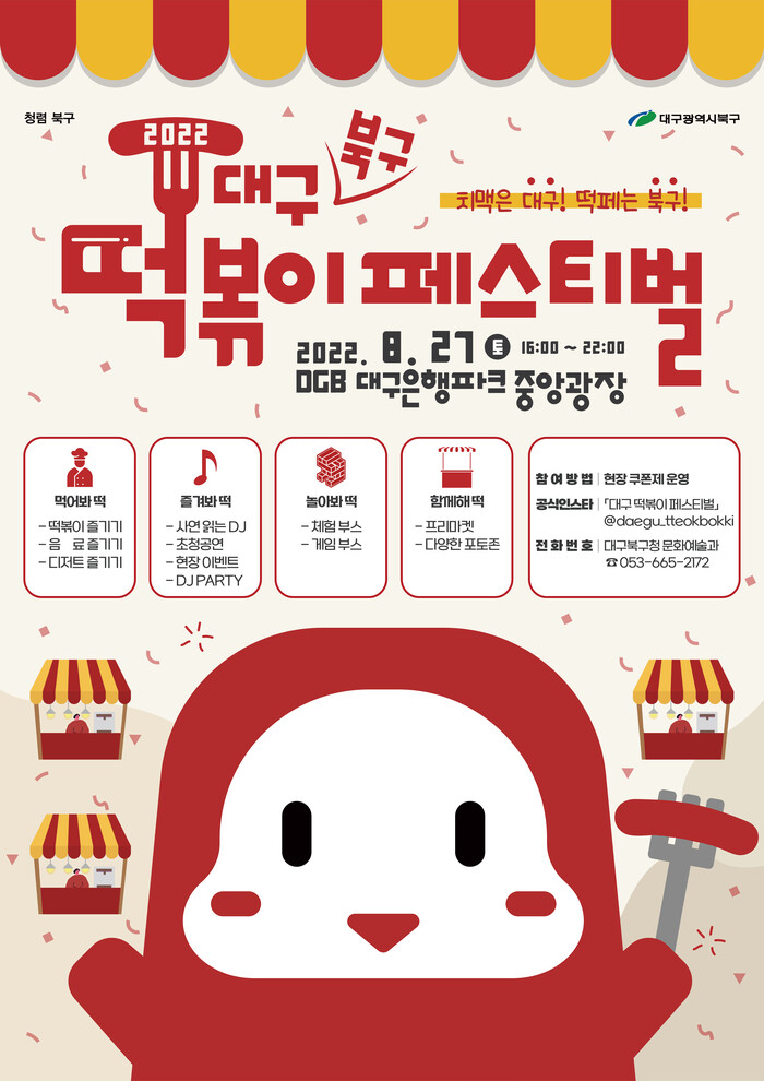 [로컬세계=박세환 기자] 대구 북구청(청장 배광식)은 오는 27일 토요일 DGB 대구은행 파크 중앙광장에서 '2022 대구 북구 떡볶이 페스티벌'을 개최한다.
