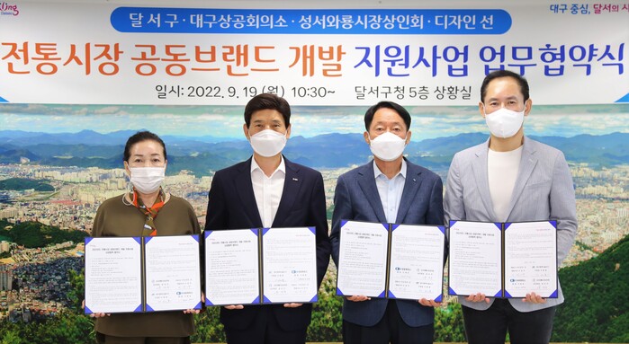 이번 협약은 이태훈 달서구청장, 이재경 대구상공회의소 상근부회장, 윤선주 와룡시장상인회 회장 그리고 이장우 디자인 선 대표 등 12명이 참석해 와룡시장 공동브랜드 개발 지원을 위한 상호협력 체계를 구축하기 위해 마련됐다.