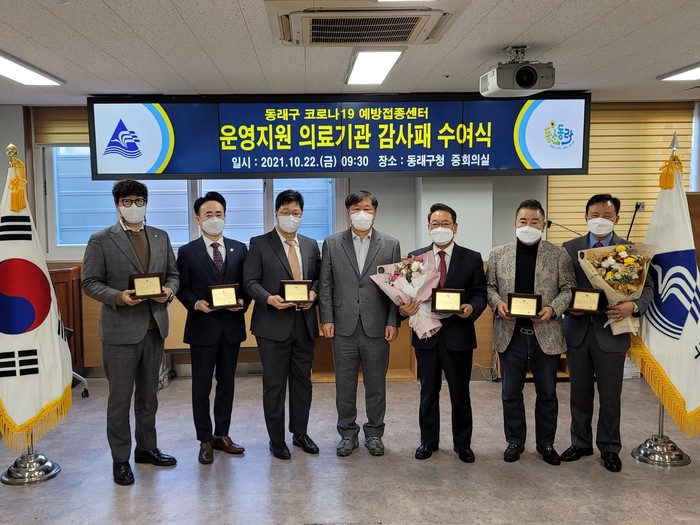[로컬세계 맹화찬 기자]부산 대동병원은 22일 오전 9시 30분 동래구청 3층 회의실에서 코로나19 유행 초기부터 지난 2년간 선별진료소 및 호흡기전담센터, 코로나19 예방접종센터 운영 등 지역 주민 건강증진에 기여한 공로를 인정받아 동래구로부터 코로나19 예방접종센터 운영지원 의료기관 감사패를 수여받았다고 밝혔다.