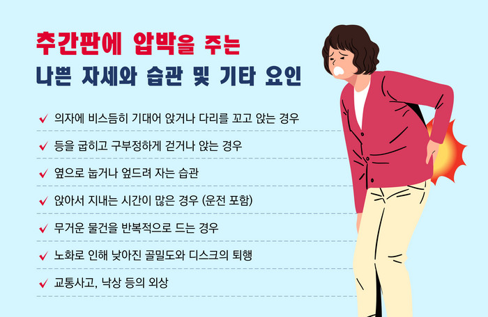 추간판은 나이가 들면서 자연스럽게 퇴행성 변화를 겪는다. 하지만, 노화 이외에도 추간판의 퇴행을 가속화시키는 요인들이 있다. 이에 강동경희대학교병원 한방재활의학과 김고운 교수는 “경추 및 요추에는 추간판의 하중을 효율적으로 분산시키기 위해 정상적인 전만 곡선이 유지돼야 하는데, 목이나 허리가 굴곡된 자세를 오래 취하는 등 잘못된 자세와 습관으로 인해 전만이 유지되지 못하면 추간판에 가해지는 압력이 증가해 빠르게 손상된다”라고 설명했다.