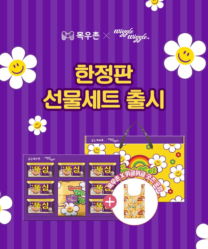 냉동간편식 곰돌이 떡갈비 스테이크와 돈까스는 100% 국내산 원료육을 사용해 안심하고 즐길 수 있고, 위글위글의 대표 곰돌이 캐릭터인 위글베어가 포장지에 인쇄되어 보는 즐거움까지 더했다. 또한,「목우촌×위글위글 뚝심세트」는 한정판 선물세트로 뚝심(200g) 7개와 위글위글 캐릭터 디자인 피크닉 백으로 구성되었다.