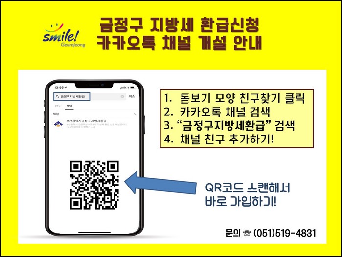 이용 방법은 스마트폰 카카오톡 앱에서 ‘금정구 지방세 환급’을 검색해 채널을 추가한 뒤 1대1 채팅방의 안내에 따라 개인정보를 입력해 환급금을 조회하고 신청하면 된다. 기타 자세한 사항은 금정구 세무2과에 문의하면 된다.