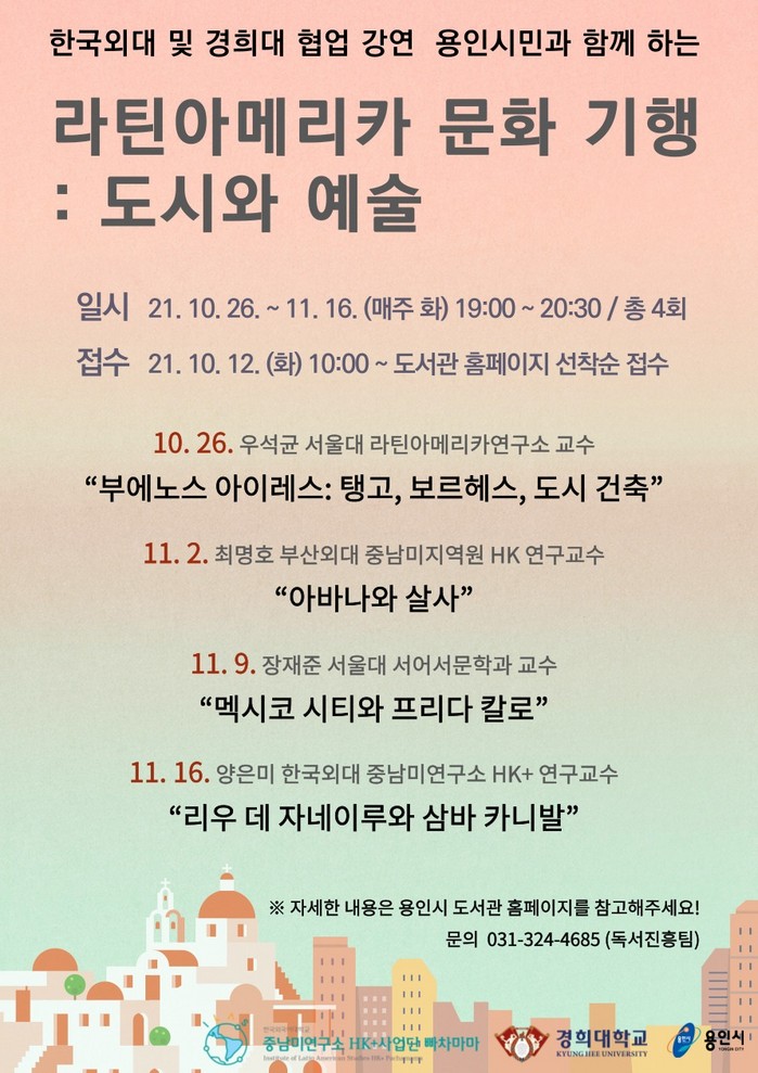[로컬세계 김병민 기자]경기 용인시 도서관사업소가 시민들을 위한 온라인 강연 ‘용인시민과 함께 하는 라틴아메리카 문화 기행: 도시와 예술’을 준비했다고 13일 밝혔다.