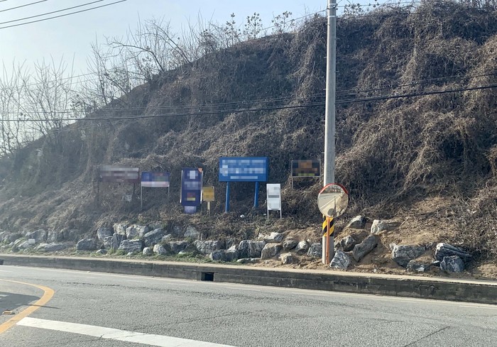 | ▲처인구 양지면 양지IC 부근 도로변에 설치된 불법 지주간판들. 용인시 제공 |