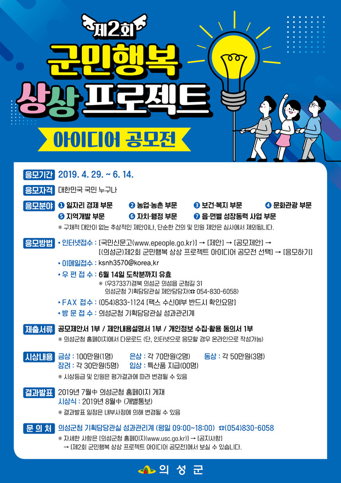 [로컬세계 박상진 기자]경북 의성군(군수 김주수)은 ‘제2회 군민행복 상상 프로젝트’아이디어 공모전을 개최한다.