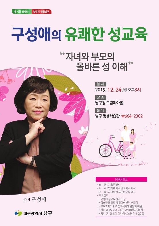 이날은 성교육 스타강사인 구성애 푸른아우성 대표를 초빙하여‘자녀 와 부모의 올바른 성 이해’라는 주제로, 올바른 성 인식을 위한 부모의 역할과 연령대별 자녀 성교육 방법에 대해 들려줄 예정이다.