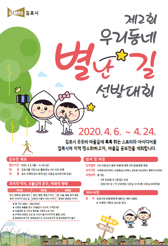 [로컬세계 김병민 기자]경기 김포시는 오는 24일까지 김포시민을 대상으로 제2회 마을안길 공모전(부제 : 우리동네 별난★길) 신청을 받는다.